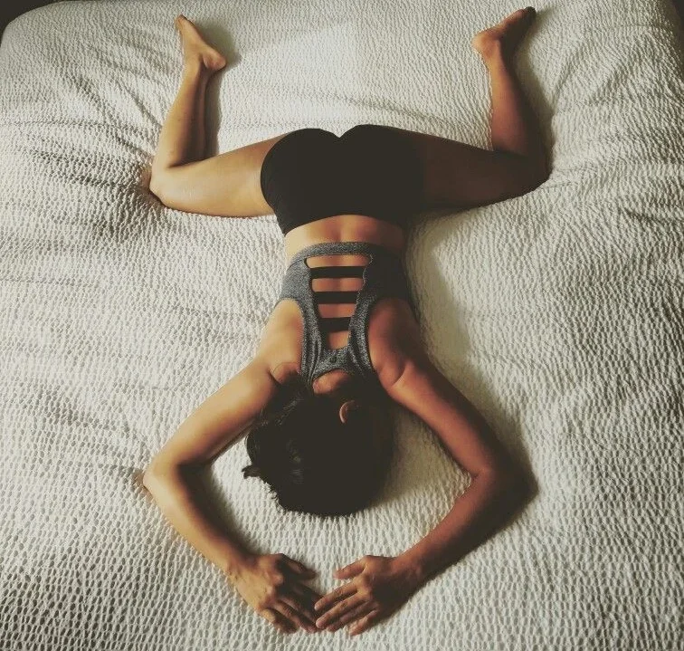 - Gently pull the bottom leg toward your chest.